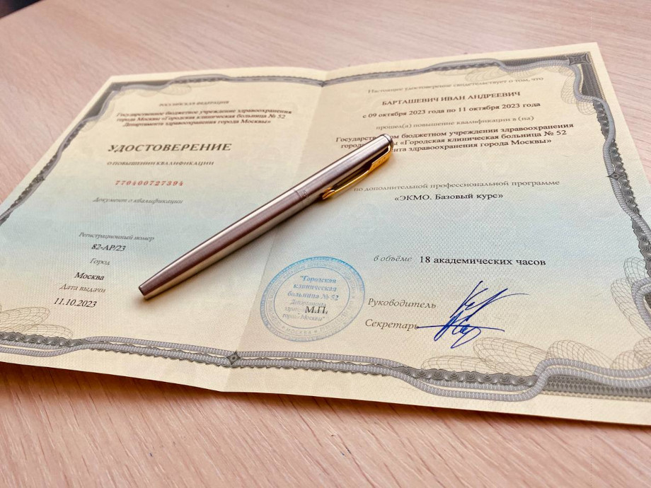 В период с 9 по 11 октября на базе ГБУЗ «Городская больница №52» Департамента здравоохранения города Москвы врачи-специалисты нашей клиники Барташевич И.А., Юревич С.В., Чака Д.В. успешно прошли обучение по экстракорпоральной мембранной оксигенации. Руководитель курса Кецкало Михаил Валерьевич - заместитель директора ФГБУ «НМИЦ акушерства, гинекологии и перинатологии им. академика В.И. Кулакова» Минздрава России – директор НМИЦ по анестезиологии и реаниматологии для беременных, президент МОО «РосЭКМО», к.м.н.
