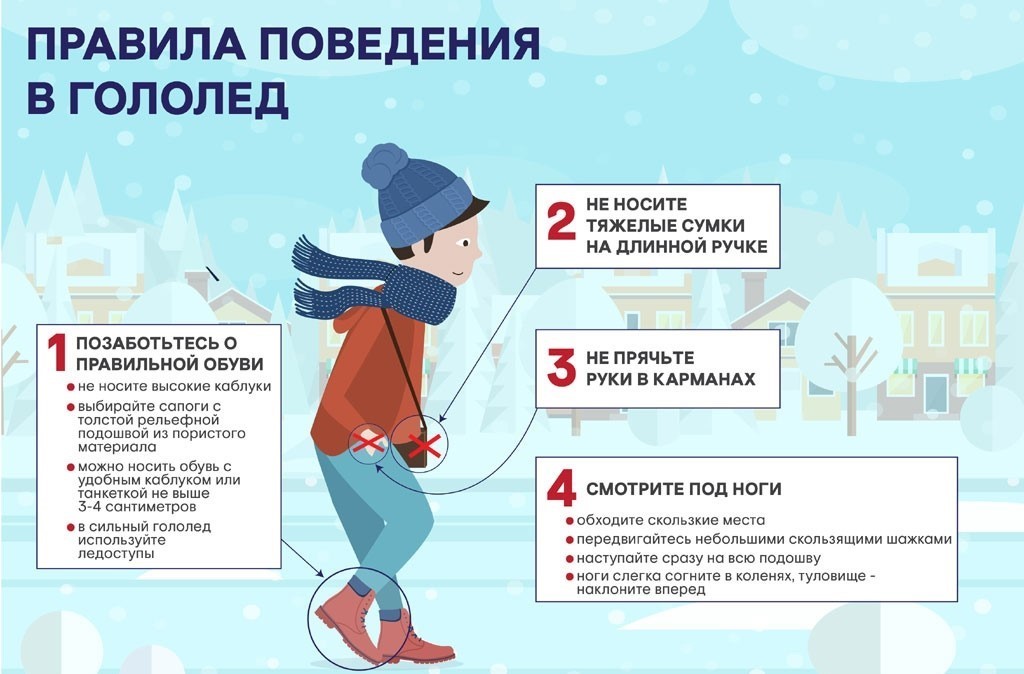 При гололеде необходимо передвигаться крайне осторожно, не нужно торопиться.