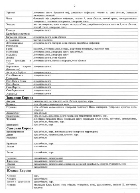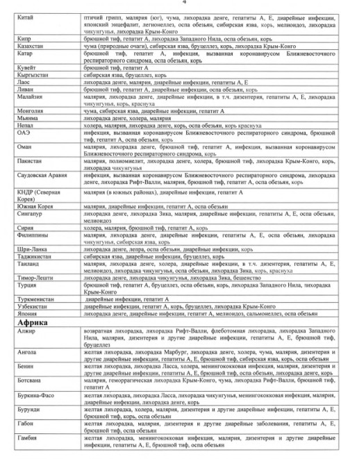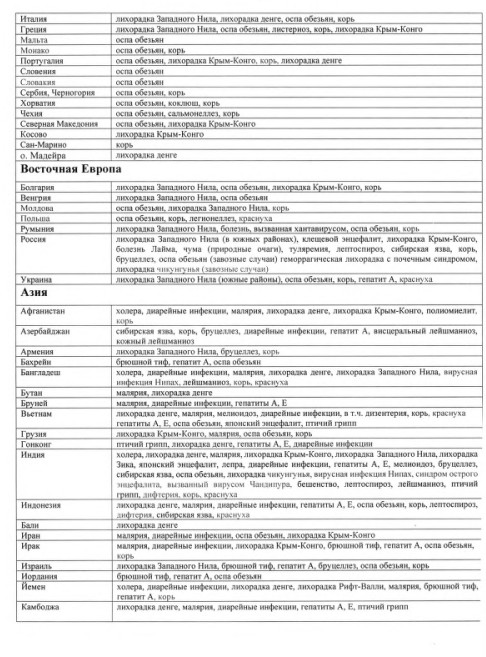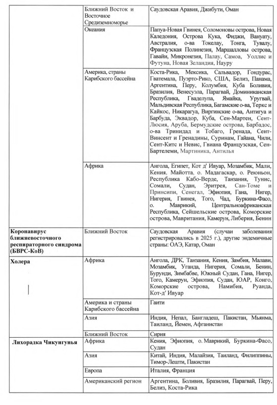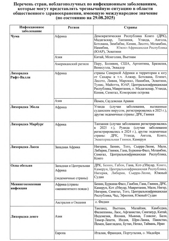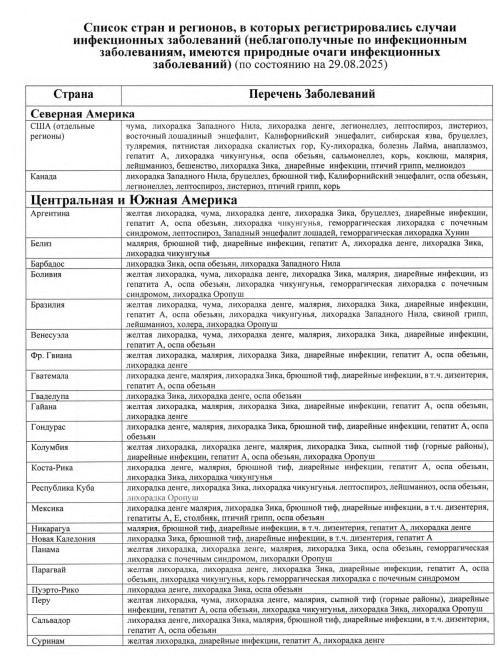 Список стран и регионов, в которых регистрировались случаи инфекционных заболеваний (неблагополучные по инфекционным заболеваниям, имеются природные очаги инфекционных заболеваний) (по состоянию на 29.08.2025)